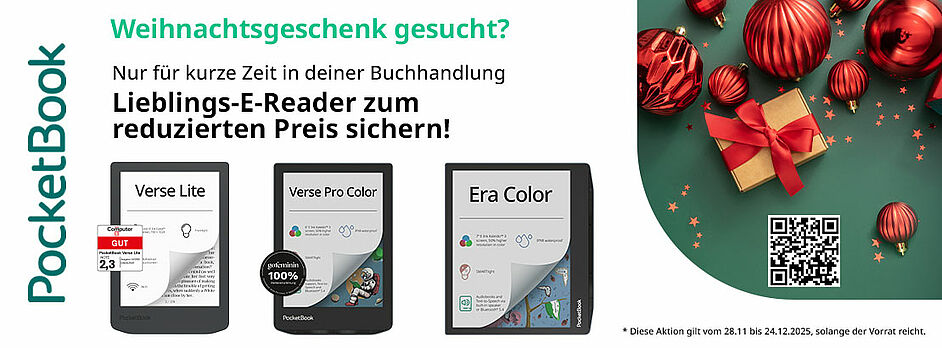 Auch in diesem Jahr gibt es rechtzeitig zum Advent die große PocketBook Weihnachtsaktion. Vom 28.11. bis 24.12.2025 gibt es drei PocketBook E-Reader zum Vorteilspreis - exklusiv in Ihrer Buchhandlung. Ihre Kundinnen und Kunden können zwischen dem kompakten und preisgekrönten Verse Pro Color, dem Einsteigergerät Verse Lite oder dem 7 Zoll großen Era Color wählen.